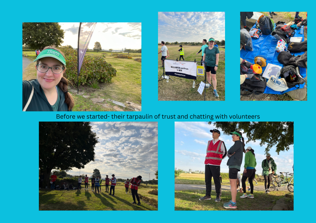 As I approached the start, one of the volunteers introduced himself- he was an English ex pat who had lived in Japan for 35 years. The other volunteers were very extremely friendly and straight away it felt like a community event (and not just one visited by tourists). The RD was doing her first stint in this role and was a bit nervous, but she was fabulous. They took loads of photos- of the volunteers, then of the first timers, then of everyone, and lots of people en route were taking photos too. There are no purple pop ups in Japan but they have these super banners with the event name on them, and here it was set up by the finish area and they were very keen for tourists to have their photos taken there, offering to take them for us. There were a few other British tourists and one guy from France (who spoke some Japanese which was super impressive). They also had little cards with QR codes on them linking to their facebook and instagram accounts as well as where the photos would be- they were very keen for everyone attending to have access to the photos. I think the banner I am holding says that we are the first timers? I was very worried about holding it upside-down but apparently it was correct.
