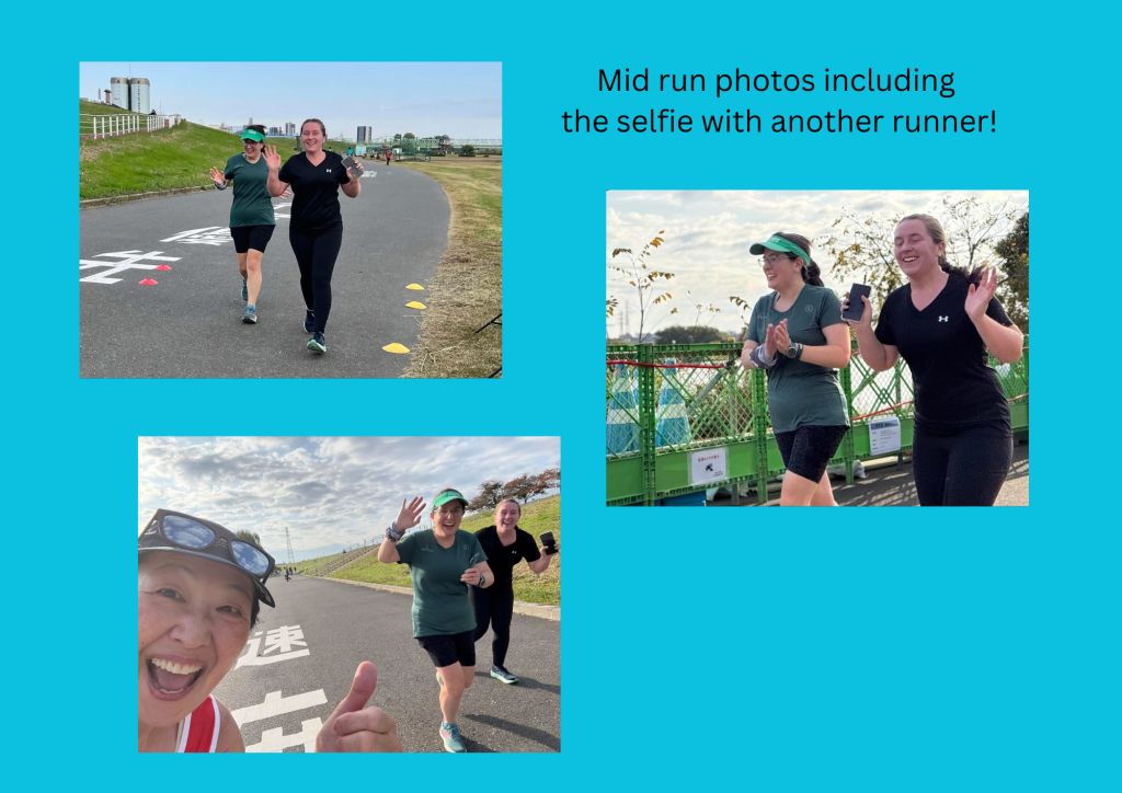 I ended up running with another tourist who had been in Tokyo since the Tuesday, and on our way around we had so many cheers and smiles from the other runners and volunteers. As it was an out and back course, you passed lots of runners out on the course so it had such a friendly feel. At one point a runner heading in the other direction took a selfie with us in the background, smiling and laughing and cheering us on, as we did to her. It would be a super fast one but after not having much to drink the day before on the flights, and not much sleep, I was sensible and ran gently, taking loads of photos and enjoying the experience.