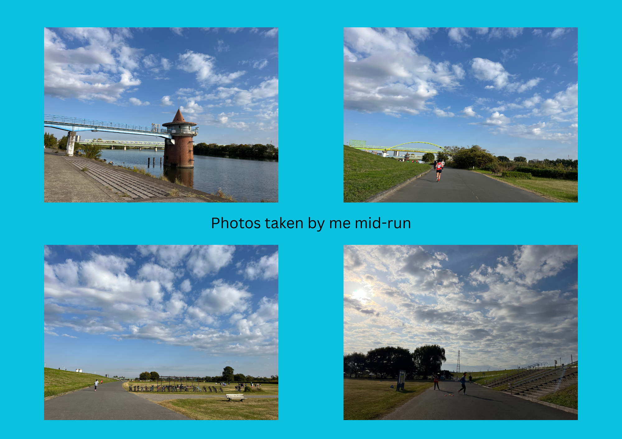 Shibamata koen kadan parkrun is a fairly new one in Tokyo (I was at event 62), and actually was super easy to get to from where we were staying. There are a few train stations in Ginza and one across the street from our hotel had a direct line to Keisei Takasago station, and it was then a 1.2 mile walk in along a straight (and very peaceful and pretty road) to where the parkrun started. (The road ends and you walk up some steps and then look down to the park alongside the river- the parkrun was visible from the top of the steps so it was very easy to find- the photo above top left shows the view from the parkrun start back up to the end of the road)