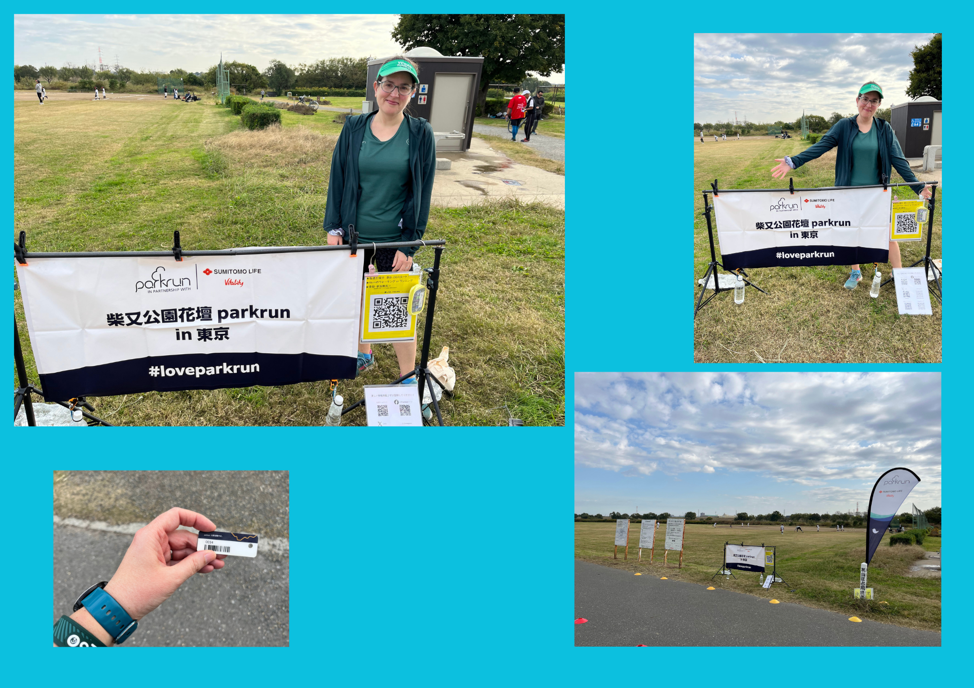 As I approached the start, one of the volunteers introduced himself- he was an English ex pat who had lived in Japan for 35 years. The other volunteers were very extremely friendly and straight away it felt like a community event (and not just one visited by tourists). The RD was doing her first stint in this role and was a bit nervous, but she was fabulous. They took loads of photos- of the volunteers, then of the first timers, then of everyone, and lots of people en route were taking photos too. There are no purple pop ups in Japan but they have these super banners with the event name on them, and here it was set up by the finish area and they were very keen for tourists to have their photos taken there, offering to take them for us. There were a few other British tourists and one guy from France (who spoke some Japanese which was super impressive). They also had little cards with QR codes on them linking to their facebook and instagram accounts as well as where the photos would be- they were very keen for everyone attending to have access to the photos. I think the banner I am holding says that we are the first timers? I was very worried about holding it upside-down but apparently it was correct.