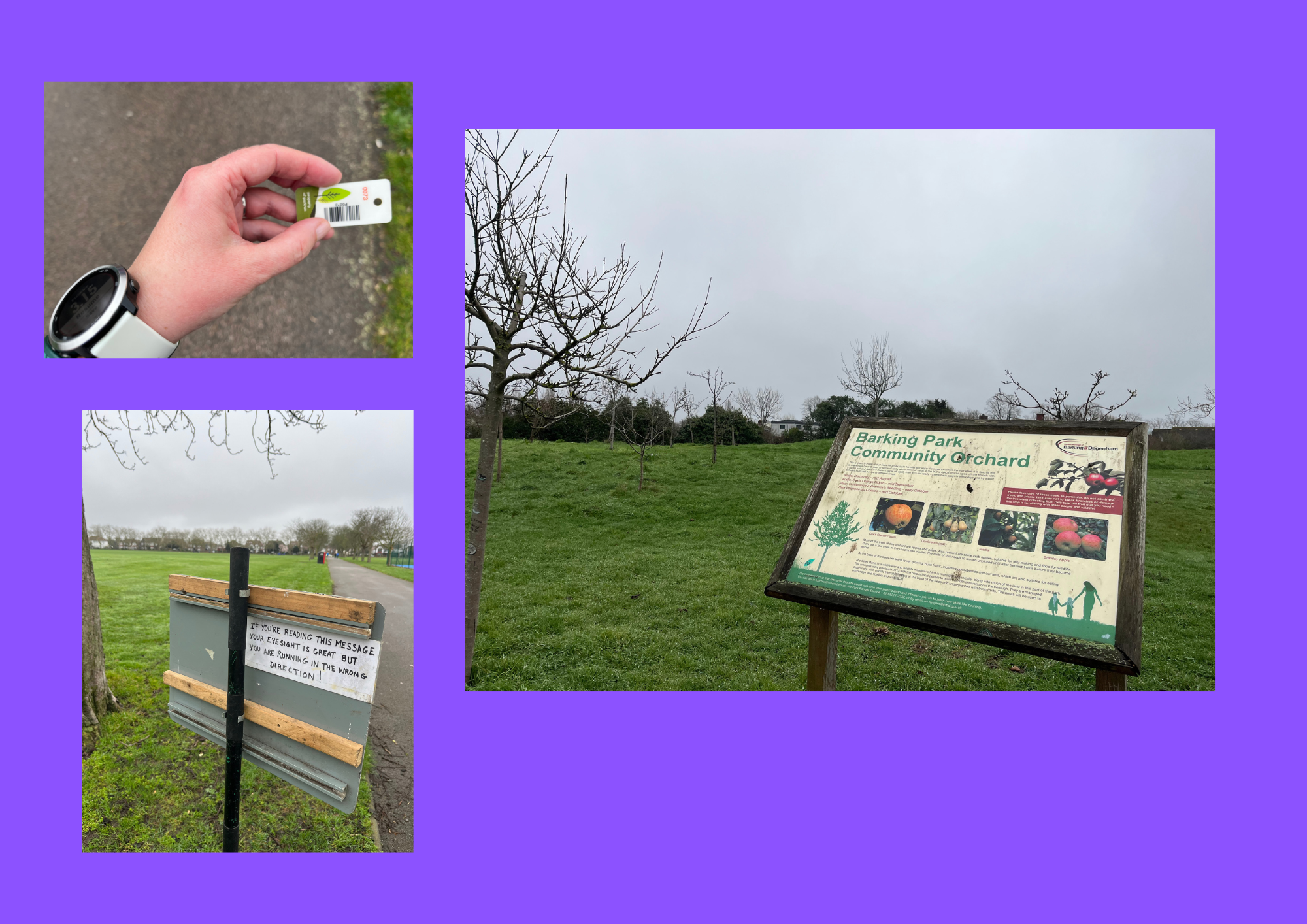 Token and the back of the “half way” sign which reads “If you’re reading this message your eyesight is great but you are running in the wrong direction!”/ Community Orchard seen on the way out