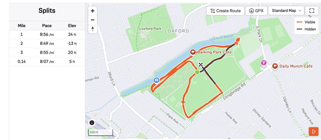 With lots of London tourism, trains are preferable, particularly when travelling back as the roads just get so busy and you can just relax on a train. However, the train route to Barking wasn’t simple, involving 3 changes, and meant getting a train at about 6:45am. Andy suggested driving, and when I looked it was a 55 min drive, which isn’t too bad (and a lot quicker than the 2 hour train journey). The drive was fine and fairly quiet, and we parked up in the car park by the allotments (mentioned on the course page) just before 8:30, which gave us time to wander through the park, see the start area and find the toilets.
