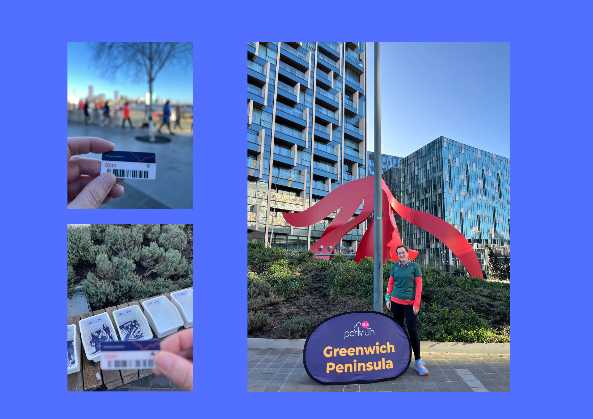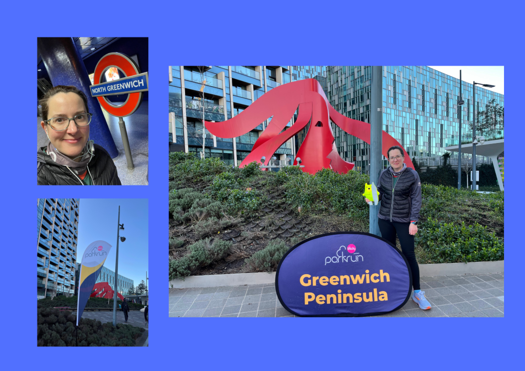 Anyway, all was well, and I got the Jubilee line there from Southwark, arriving at North Greenwich station at about 8:15am. I had allowed plenty of time as on a few previous London trips even going through the train station has taken a while (going to Burgess I spent so long in London Bridge station getting to the tube that I nearly missed the start of parkrun), and although it looked close at the other end I didn’t know how easy it would be to find once there. In the end the train journey was meant to take 20 mins but I am sure it wasn’t that long, and the parkrun start was so close to the tube station, although I was following google maps which was going to take me around the houses a bit, but I happened to glance to the right and saw the big red sculpture that I recognised from all the pop up signs.