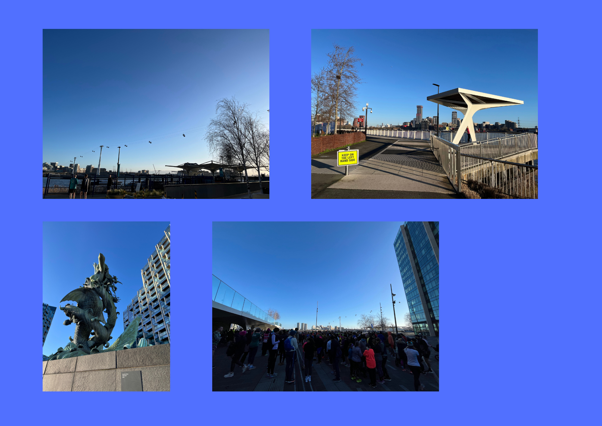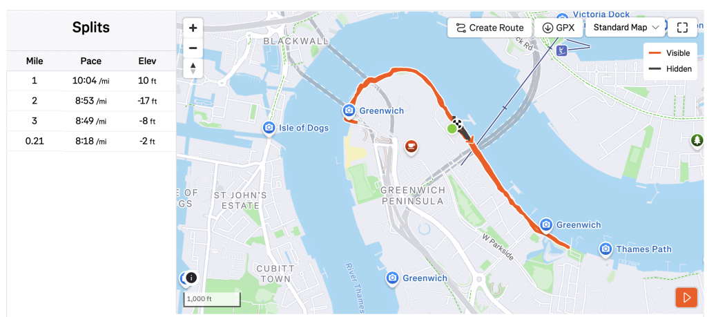 I really enjoyed this- it’s basically an out and back (although you start in the middle- if you looked at it from above you go right, u-turn, back past the finish, u-turn again, back past the finish and then a bit further before the final u-turn) you run past the O2 and then in the other direction have views out to the Thames Barrier. There were various sculptures to see, and loads of tourists arriving for the O2 which made it feel very central to London rather than being in a suburb which they often are.
