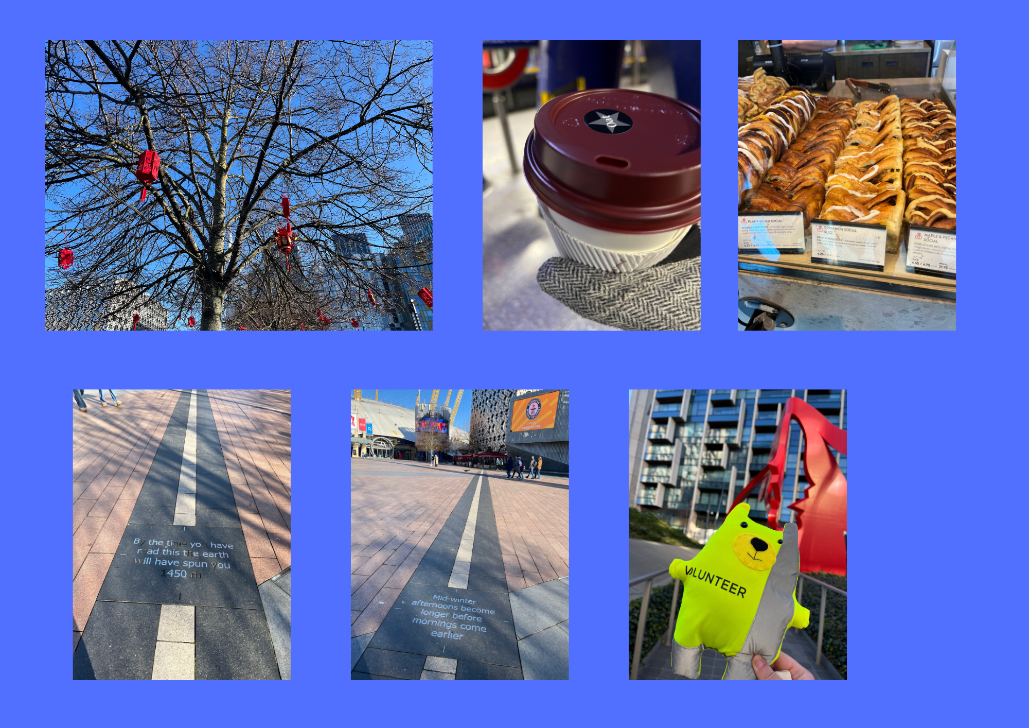 Admiring the GMT themed paving stones/ tea to warm up/ breakfast/ Poddington the Wonky Bear