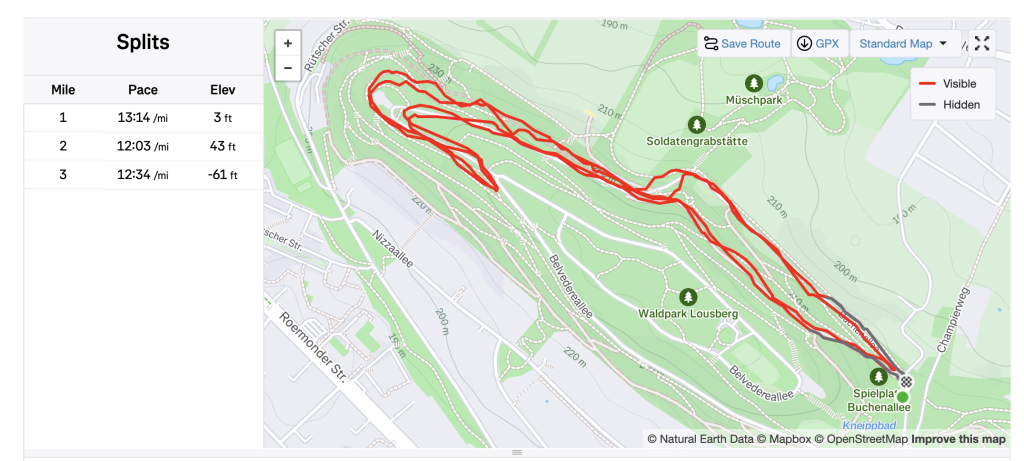 As I left the hotel it was barely drizzling, and I enjoyed looking at some of the pretty buildings on my way. My train wasn’t until after midday, so I was planning on going back to the hotel, showering and then having a wander around Aachen before getting my train. The weather had other plans! The route was fairly uphill (it was 1.45 miles there, and in the final .45 mile the elevation gain was 152ft which sounds like a lot?)- getting into the park involved some steep footpaths.