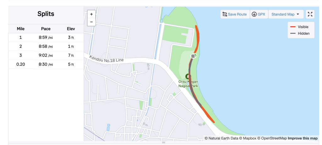 As we arrived they called us over for the first timers welcome which was in English and Japanese. The course was very simple- starting in the middle going out and back in one direction, then out and back in the other, repeating this, and then one more out and back in one direction (so 5 out and backs starting in the middle). The turnaround points were just about visible from the start area, and they had marshals at each turnaround point. They had recently celebrated their 4th birthday and had some bunting and a little celebration board hanging up.